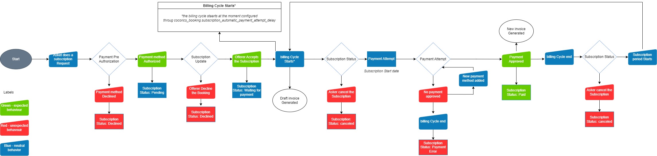 The billing cycle start date is triggered "X" days before the subscription period start date. where "X" = cocorico_booking.subscription_automatic_payment_attempt_delay. By default, the billing cycle starts two days before the subscription's start date.