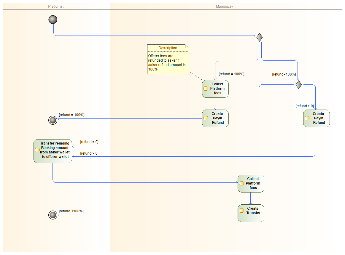 In case of a cancellation on a reservation paid by credit card, the asker is automatically refunded and the wallet-to-wallet transfer plus commission transfer is done directly and the super administrator from the platform will be able to finalize the operation by authorizing the PayOut.