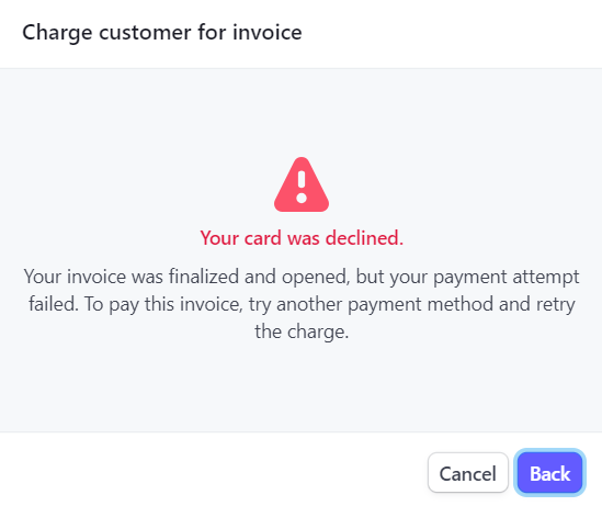 Click and open the invoice and attempt a new payment method by pressing the button "Charge Customer". Add a "Decline after attaching Stripe card" (4000000000000341). To complete the process, we need to check the following message displayed in Stripe: