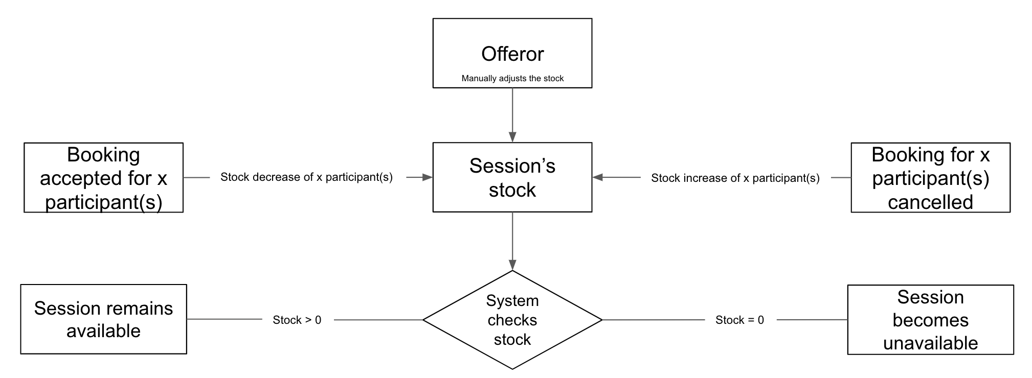 When a booking of X participants is accepted, the system will decrease the stock by this number.