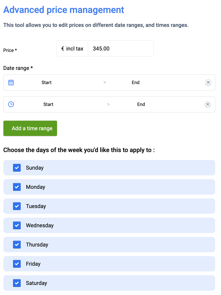 Recurring prices (figure 20) are a way to set prices over recurring weekdays (e.g. weekends are more expensive than weekdays).
