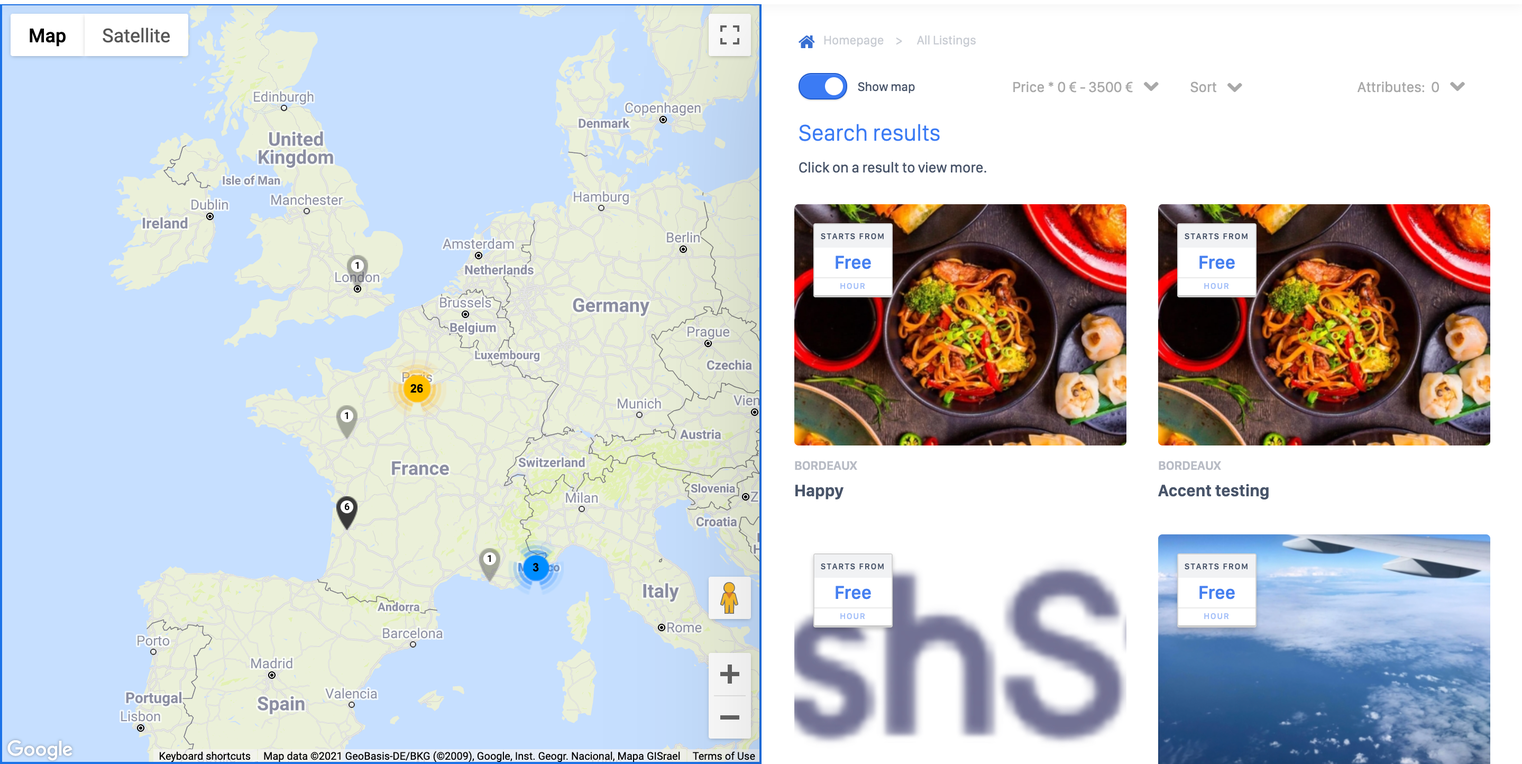 The map on the left side of the page is interactive. It generally uses Google Maps API (but can be replaced by another mapping tool according to the platform’s specifications).