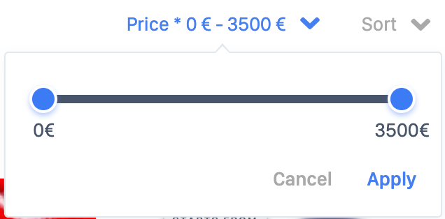 The range field is updated through a slider motion on both ends and validated through the “Apply” button. It will update the search results page to display only listings matching the selected price range.