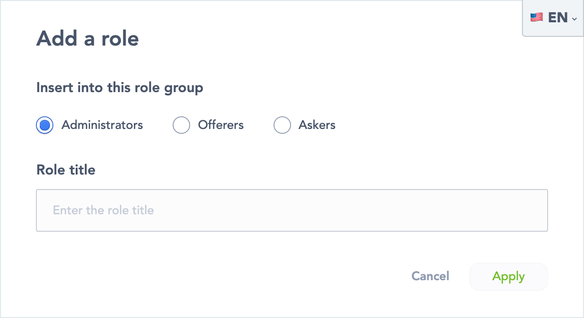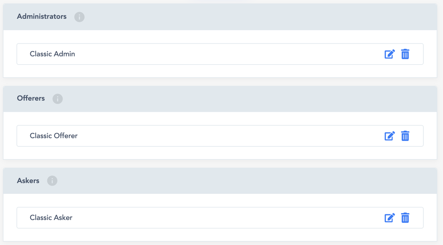 The 3 roles types “Administrators”, “Offerors”, Askers” remain constant