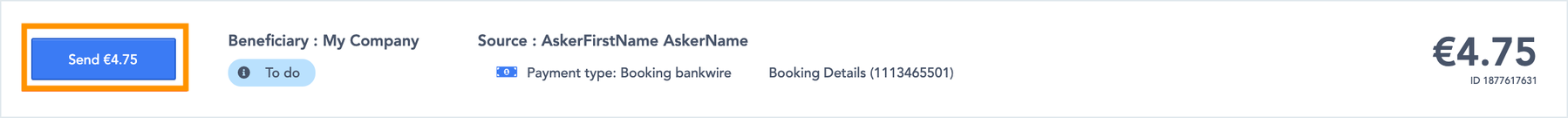 The other way to do it is, to click on the pen feature. Super-administrators or administrators will be redirected to the payment detail page. On the right side, super-administrators or administrators will have the button “Send €x to …” (figure 10).