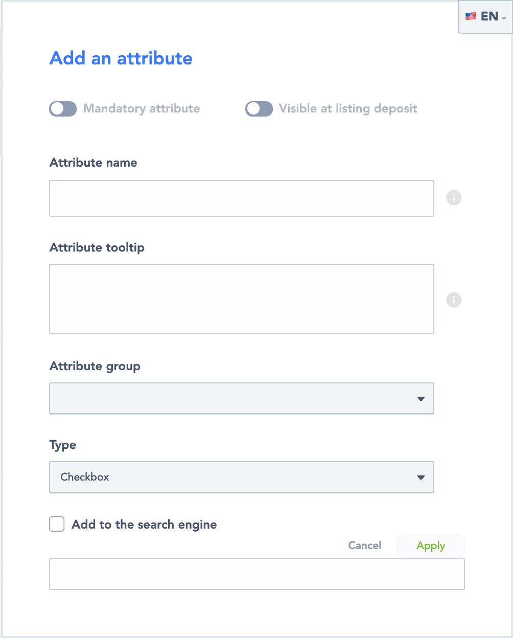 Switch buttons “Mandatory attribute” and “Visible at listing deposit” at the top of the form allows to make this attribute mandatory or make it visible for offerers on the deposit listing page. Click on the switch button to activate the feature.