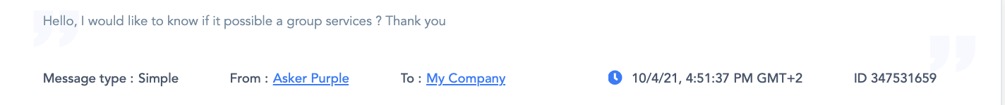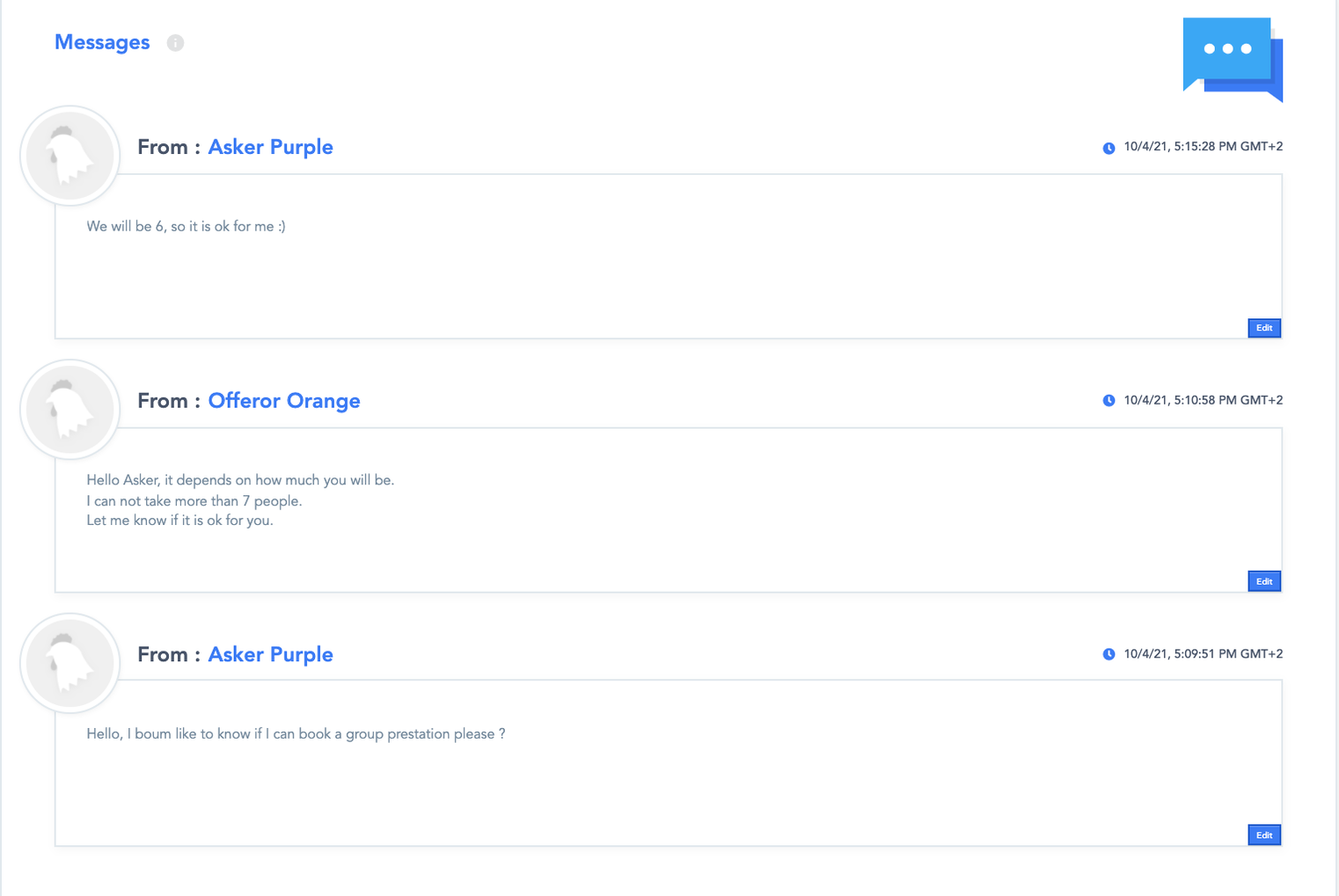 A thread is created for each booking request. The offeror can accept the request directly, or discuss it with the asker to decide whether to accept or refuse a request. If a message is sent during the service request, OR when the service is pending/in progress, it creates threads associated with the provided service.