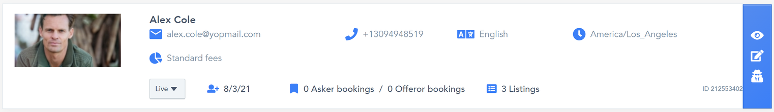 Click on the “eye” icon to view the user’s public profile as it is viewed by customers and vendors in the front office. This will open a new tab.