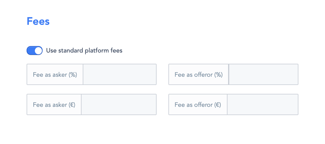 Operators can decide to apply the default platform fees (by default) or apply user-specific fees. Fees are applied to users when they make purchases (Fee as asker) and when they make sales (Fee as offeror). They can be set both as percentages and as fixed amounts (one or both).
